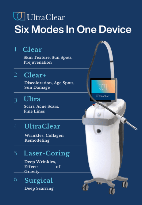 UltraClear® is the first disruptor in laser resurfacing in decades. Utilizing the latest advancements in fiber laser technology, UltraClear delivers fractionated ablative sub-pulses for optimal skin rejuvenation. Addressing facial aging concerns such as sun damage, fine lines, wrinkles, scars, and acne scars, UltraClear creates microchannels triggering natural exfoliation and stimulating collagen without excessive bulk heating. The result? Quicker, more comfortable, precise treatments with increased safety for skin of color.